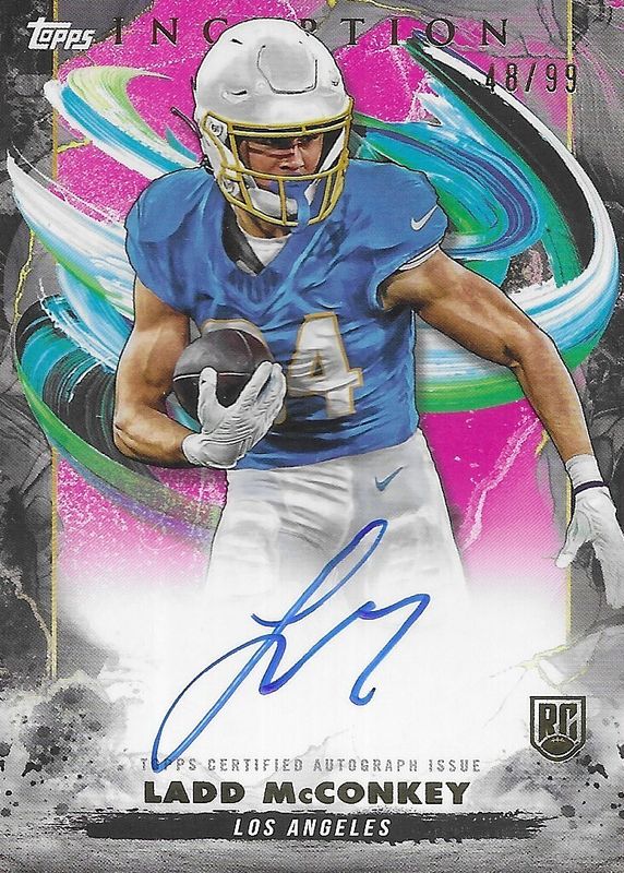 The Ladd McConkey 2024 Topps Inception #RA-LM Rookie Autographs - Magenta /99 card in Raw condition has not changed in price in the last 30 days and was last sold for $75.00 .