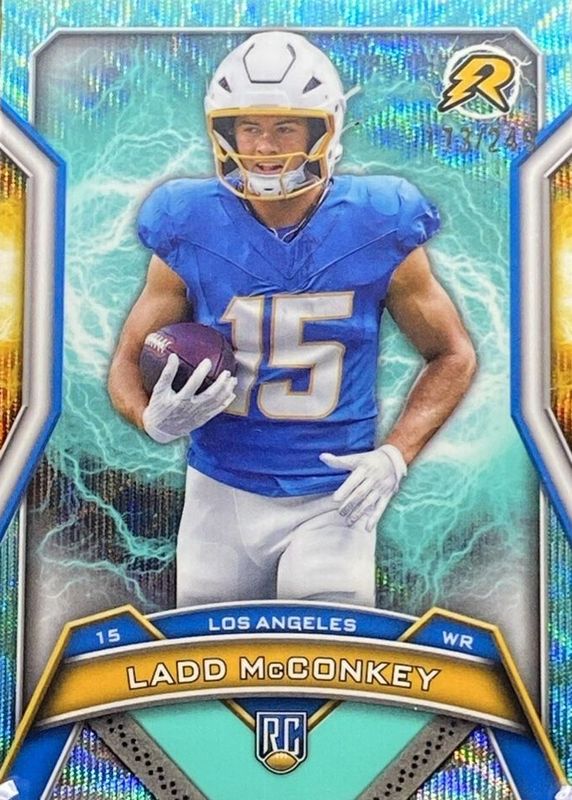 The Ladd McConkey 2024 Topps Resurgence #154 Aqua Surge Refractor /249 Rookie card in Raw condition has not changed in price in the last 30 days and was last sold for $2.25 .