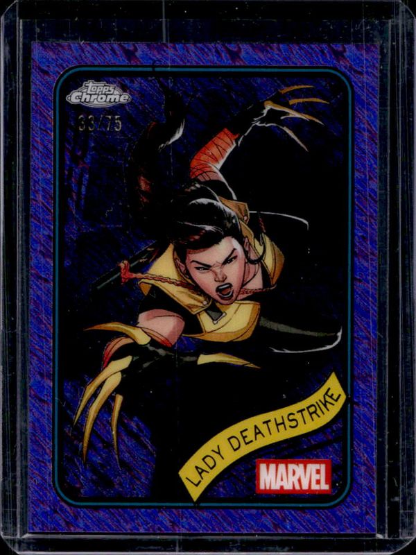 The Lady Deathstrike 2025 Topps Chrome #64 Purple Shimmer Refractor /75 card is 1 of 23 Lady Deathstrike's card variations in the 2025 Topps Chrome set being tracked by Sports Card Investor, including Base, Refractor, Yellow Lava Refractor, Spider Web Refractor /399, and Blue Refractor /299.