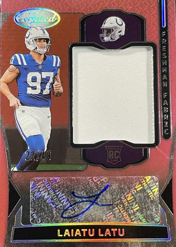 The Laiatu Latu 2024 Certified #FMS-LLU Freshman Fabric Signatures - Mirror Pink Etch /49 Rookie card in Raw condition has not changed in price in the last 30 days and was last sold for $8.02 .