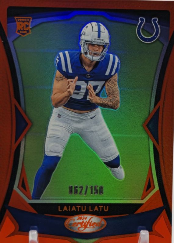 The Laiatu Latu 2024 Certified #111 Mirror Orange /150 Rookie card in Raw condition has not changed in price in the last 30 days and was last sold for $1.30 .