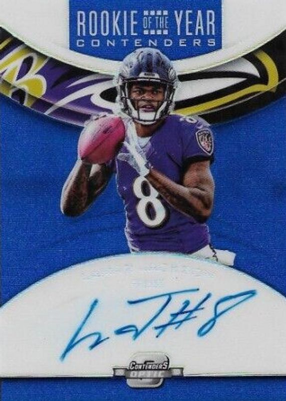 The Lamar Jackson 2018 Contenders Optic #RYA-LJ Rookie of the Year Contenders Autographs - Blue /25 card in Raw condition has not changed in price in the last 30 days and was last sold for $550.00 .