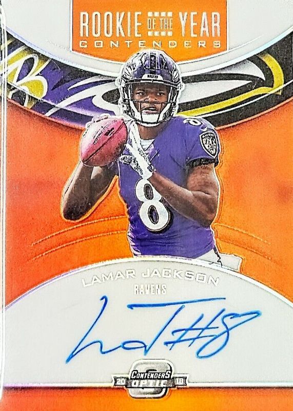 The Lamar Jackson 2018 Contenders Optic #RYA-LJ Rookie of the Year Contenders Autographs - Orange (/35) card in Raw condition has not changed in price in the last 30 days and was last sold for $510.00 .