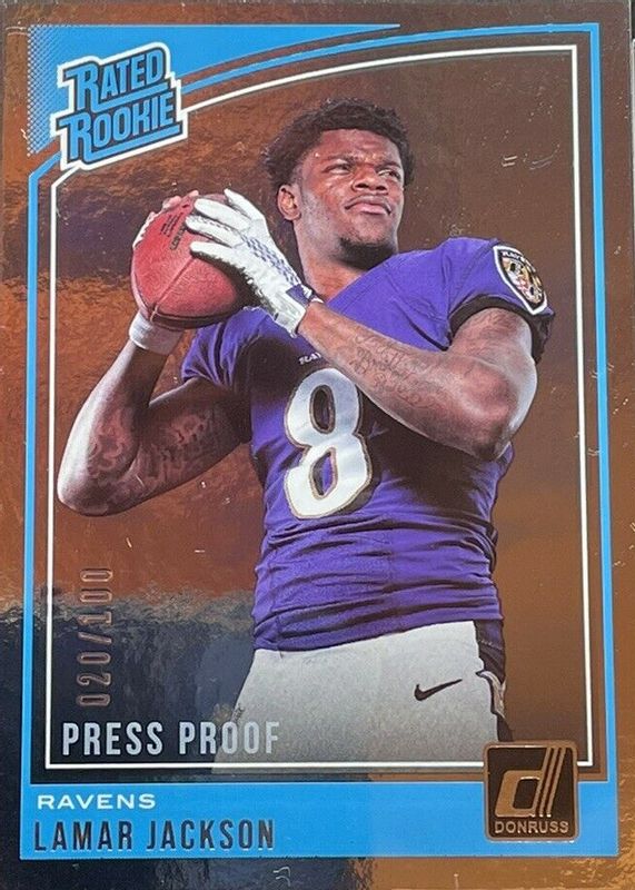 The Lamar Jackson 2018 Donruss #317 Press Proof Silver /100 Rookie card in Raw condition has not changed in price in the last 30 days and was last sold for $175.00 .