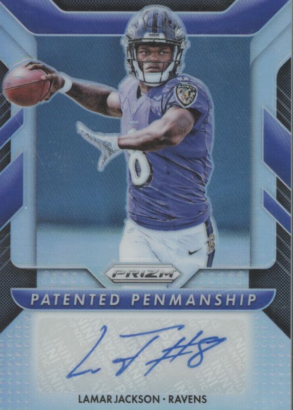The Lamar Jackson 2018 Prizm #PPP-LJ Patented Penmanship (/25) Rookie card in Raw condition has not changed in price in the last 30 days and was last sold for $598.88 .