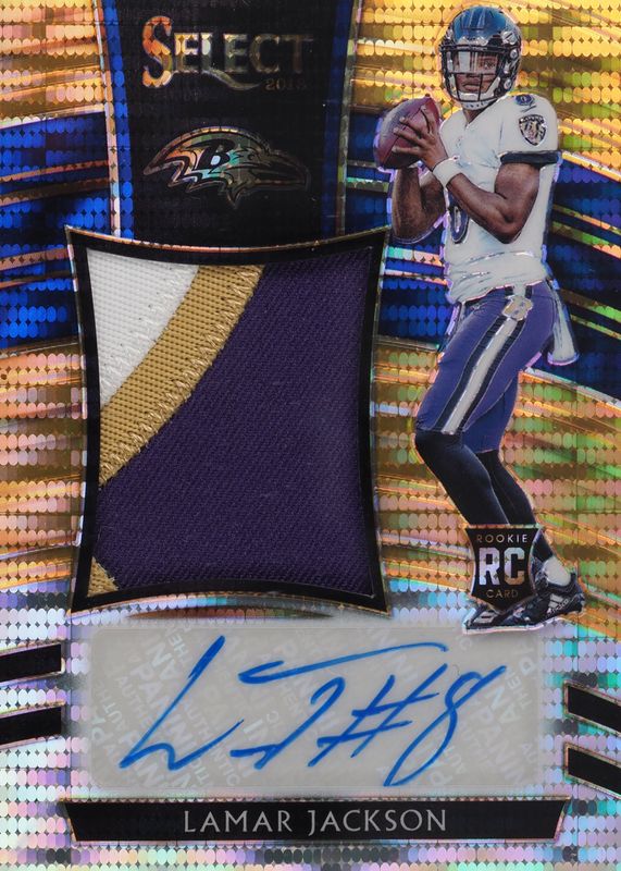 Best Prices Available For Sale of Lamar Jackson 2018 Select #JM-LJ Jumbo Rookie Signature Swatches - FOTL Neon Orange Pulsar /23
