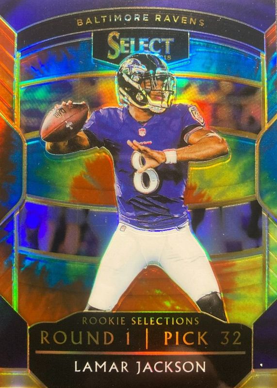 The Lamar Jackson 2018 Select #RS-12 Rookie Selections - Tie-Dye /25 card in Raw condition has not changed in price in the last 30 days and was last sold for $285.50 .