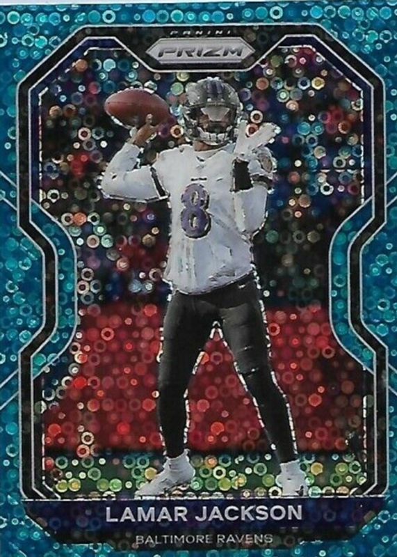 This card is 1 of 29 Lamar Jackson's card variations in the 2020 Prizm set being tracked by Sports Card Investor, including Silver, Orange /249, Blue Wave /199, Hyper /175, and Red Wave /149.
