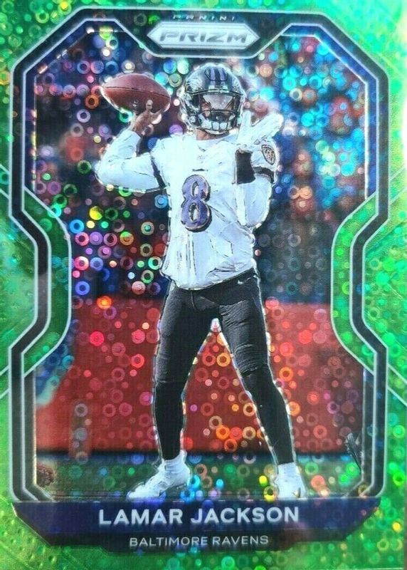 The Lamar Jackson 2020 Prizm #37 No Huddle Neon Green /5 card in Raw condition has not changed in price in the last 30 days and was last sold for $77.00 .