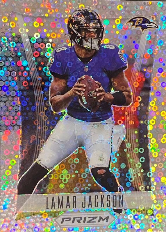 This card is 1 of 12 Lamar Jackson's card variations in the 2022 Prizm set being tracked by Sports Card Investor, including Fireworks - Green Ice, Prizm Flashback - Silver, Fireworks - Blue Ice /99, Profiles /(SSP), and Fireworks - Purple Power /49.