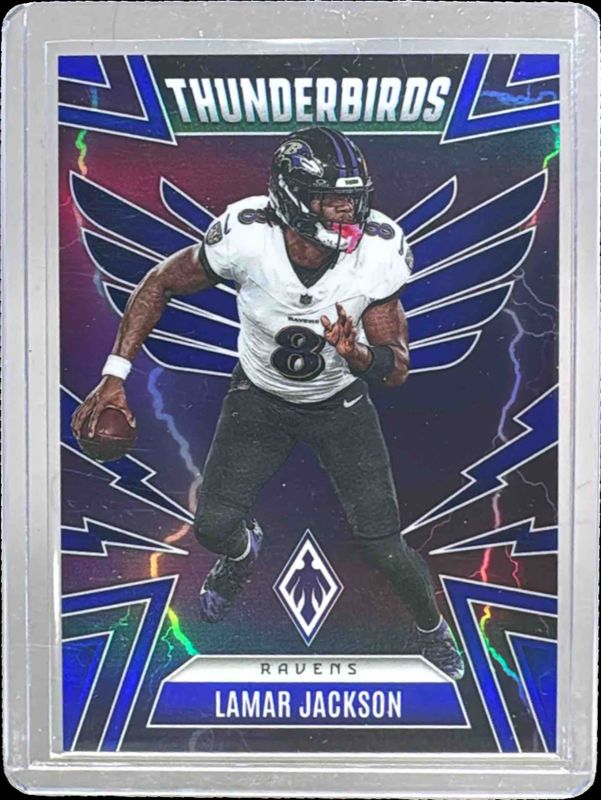 The Lamar Jackson 2025 Phoenix #4 Thunderbirds - Blue /199 card is 1 of 118 Lamar Jackson's card variations in the 2025 Phoenix set being tracked by Sports Card Investor, including Base, Silver, Silver Hyper, Silver Lava, and Silver Lazer.