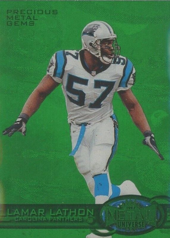 This card is 1 of 2 Lamar Lathon's card variations in the 1997 Metal Universe set being tracked by Sports Card Investor, including Precious Metal Gems Red /135.