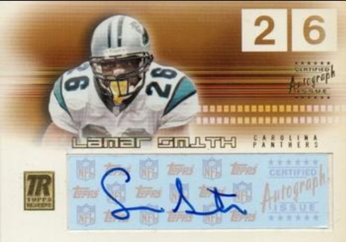 The Lamar Smith 2002 Topps Reserve #RALS Autographs card is 1 of 2 Lamar Smith's card variations in the 2002 Topps Reserve set being tracked by Sports Card Investor, including Base /999.