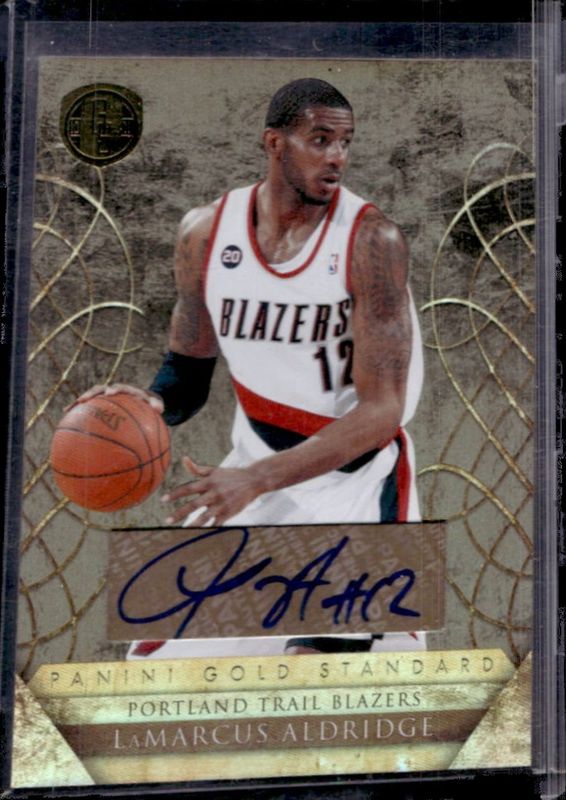 The LaMarcus Aldridge 2010 Gold Standard #34 Signatures /25 card is 1 of 20 LaMarcus Aldridge's card variations in the 2010 Gold Standard set being tracked by Sports Card Investor, including Base /299, Platinum Gold /25, Black Gold /1, Gold Bars /299, and Gold Nuggets /299.