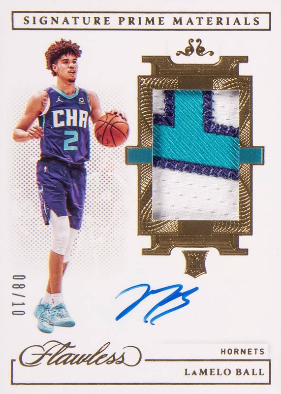The LaMelo Ball 2020 Flawless #SPM-LAM Signature Prime Materials - Gold /10 Rookie card in Raw condition has not changed in price in the last 30 days and was last sold for $24,000.00 .