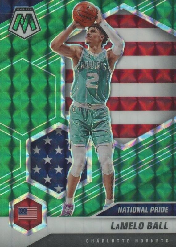 The LaMelo Ball 2020 Mosaic #257 National Pride - Green Rookie card in Raw condition has moved down -$1.75 (-63.6%) in the last 30 days and was last sold for $1.00 .