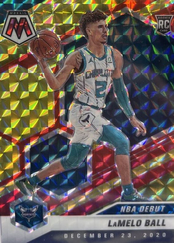 The LaMelo Ball 2020 Mosaic #262 NBA Debut - Choice Fusion Red & Yellow /88 Rookie card in Raw condition has not changed in price in the last 30 days and was last sold for $77.69 .