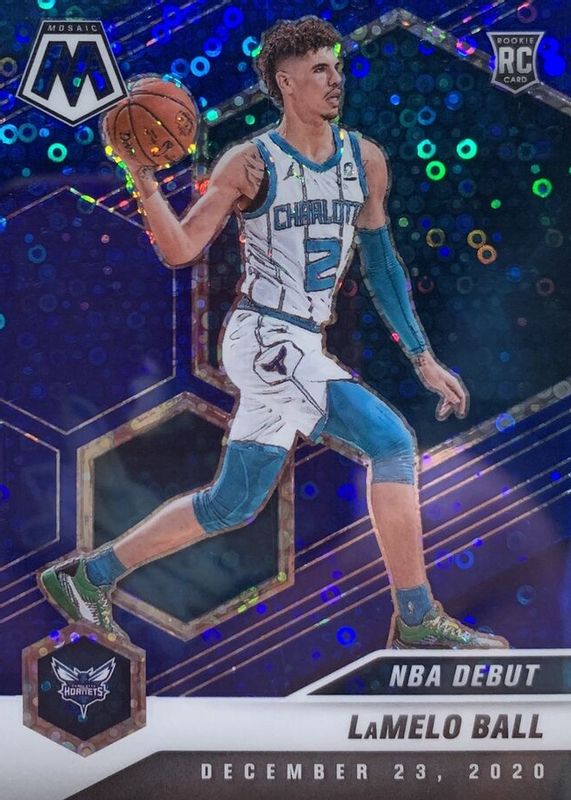 The LaMelo Ball 2020 Mosaic #262 NBA Debut - Fast Break Blue /85 Rookie card in Raw condition has not changed in price in the last 30 days and was last sold for $114.50 .