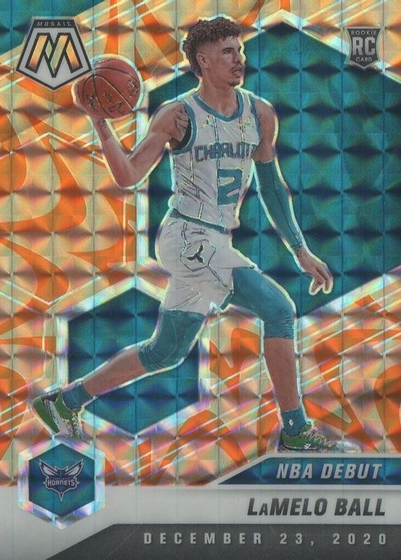 The LaMelo Ball 2020 Mosaic #262 NBA Debut - Reactive Orange Rookie card in Raw condition has not changed in price in the last 30 days and was last sold for $3.99 .