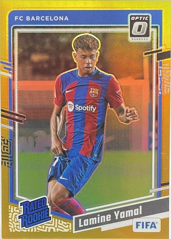 The Lamine Yamal 2023 Donruss #177 Optic - Gold /10 (Club) Rookie card in Raw condition has not changed in price in the last 30 days and was last sold for $4,250.20 .