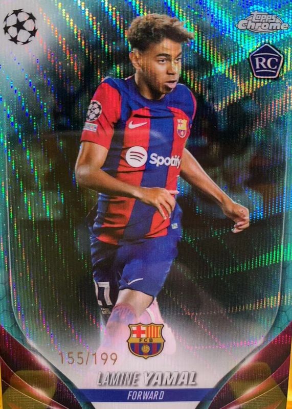 The Lamine Yamal 2023 Topps Chrome UEFA Club Competitions #64 Aqua Wave Refractor /199 Rookie card in Raw condition has not changed in price in the last 30 days and was last sold for $208.00 .