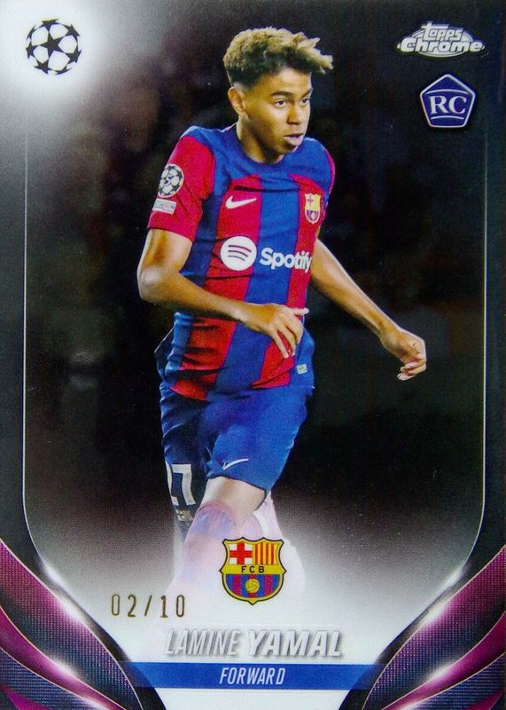 The Lamine Yamal 2023 Topps Chrome UEFA Club Competitions #64 Black Refractor /10 Rookie card in Raw condition has not changed in price in the last 30 days and was last sold for $2,193.00 .