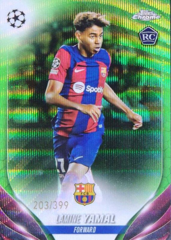 Best Prices Available For Sale of Lamine Yamal 2023 Topps Chrome UEFA Club Competitions #64 Neon Green Wave Refractor /399