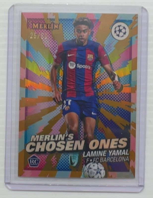 The Lamine Yamal 2023 Topps Merlin Chrome UEFA Club Competitions #MC-1 Merlin's Chosen One - Gold Refractor /50 Rookie card is 1 of 63 Lamine Yamal's card variations in the 2023 Topps Merlin Chrome UEFA Club Competitions set being tracked by Sports Card Investor, including Base, Aqua Prism Refractor, Refractor, Vintage Merlin Refractor, and Neon Green Shimmer Refractor /399.