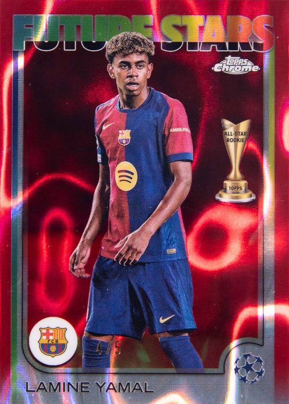 Recent Sales of Lamine Yamal 2024 Topps Chrome UEFA Club Competitions #27 Red Lava Refractor /5 PSA 8