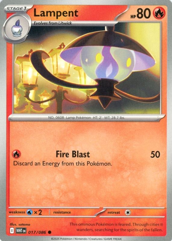 The Lampent 2025 Scarlet & Violet: White Flare #017/086 Base card in Raw TCG (Near Mint) condition has not changed in price in the last 30 days and was last sold for $1.41 .