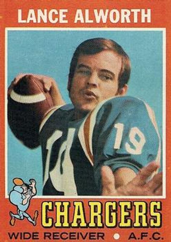 The Lance Alworth 1971 Topps #10 Base card is 1 of 4 Lance Alworth's card variations in the 1971 Topps set being tracked by Sports Card Investor, including Game Inserts, Posters, and Posters - Glossy.