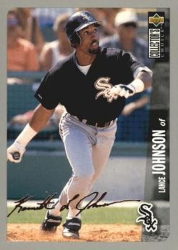The Lance Johnson 1996 Upper Deck Collector's Choice #97 Silver Signatures card is 1 of 6 Lance Johnson's card variations in the 1996 Upper Deck Collector's Choice set being tracked by Sports Card Investor, including #625 Base, #97 Base, #625 Gold Signatures, #97 Gold Signatures, and #625 Silver Signatures.