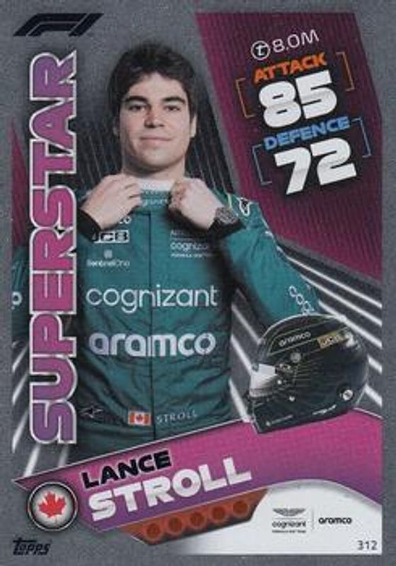 The Lance Stroll 2022 Topps Turbo Attax Formula 1 #312 Base card is 1 of 30 Lance Stroll's card variations in the 2022 Topps Turbo Attax Formula 1 set being tracked by Sports Card Investor, including #259 Base, #72 Base, #71 Base, #70 Base, and #348 Base.