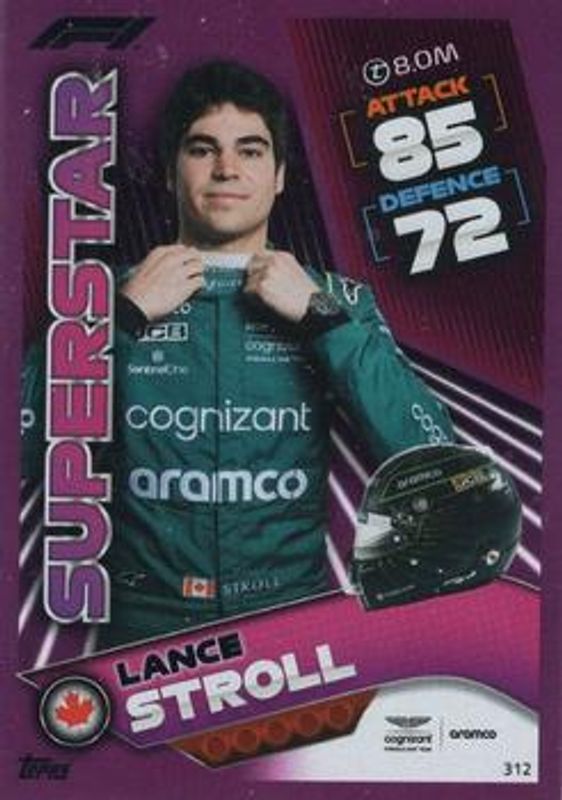 The Lance Stroll 2022 Topps Turbo Attax Formula 1 #312 Mirror Foil Pink card is 1 of 30 Lance Stroll's card variations in the 2022 Topps Turbo Attax Formula 1 set being tracked by Sports Card Investor, including #259 Base, #72 Base, #71 Base, #70 Base, and #348 Base.
