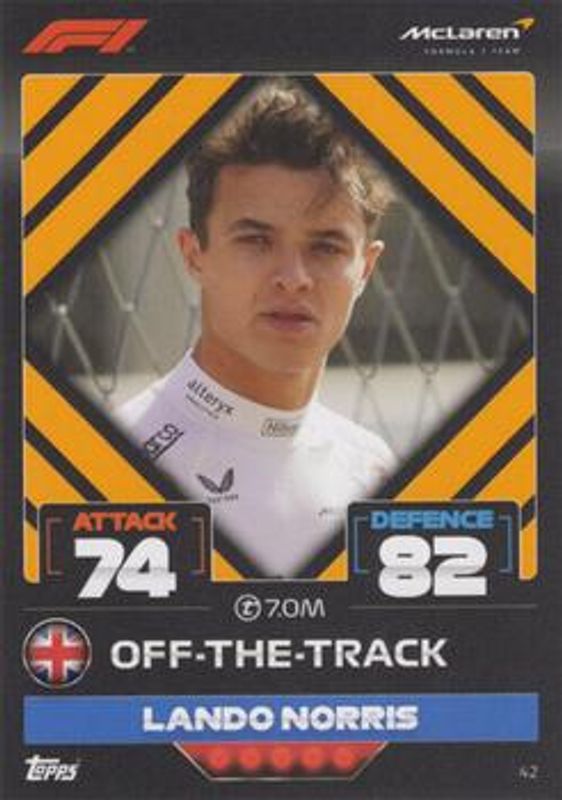 The Lando Norris 2022 Topps Turbo Attax Formula 1 #42 Base card is 1 of 38 Lando Norris' card variations in the 2022 Topps Turbo Attax Formula 1 set being tracked by Sports Card Investor, including #274 Base, #243 Base, #250 Base, #287 Base, and #41 Base.