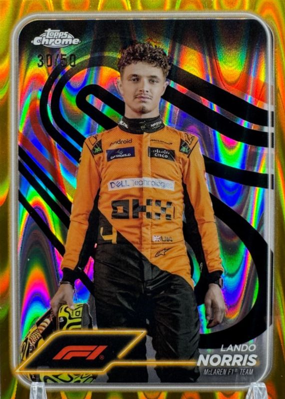 The Lando Norris 2024 Topps Chrome Formula 1 #7 Gold RayWave Refractor /50 card in Raw condition has not changed in price in the last 30 days and was last sold for $56.50 .