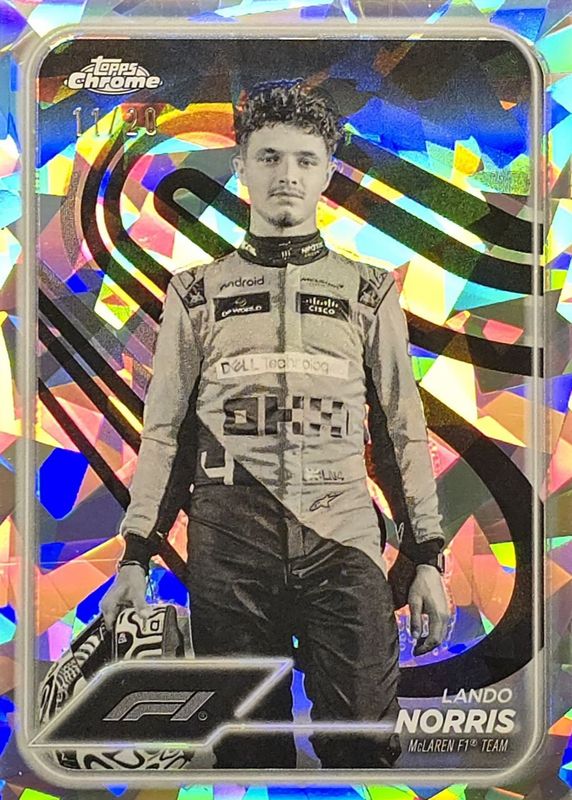 This card is 1 of 8 Lando Norris' card variations in the 2024 Topps Chrome Formula 1 Sapphire Edition set being tracked by Sports Card Investor, including Base, Aqua /99, Gold /50, Orange /25, and Purple /10.