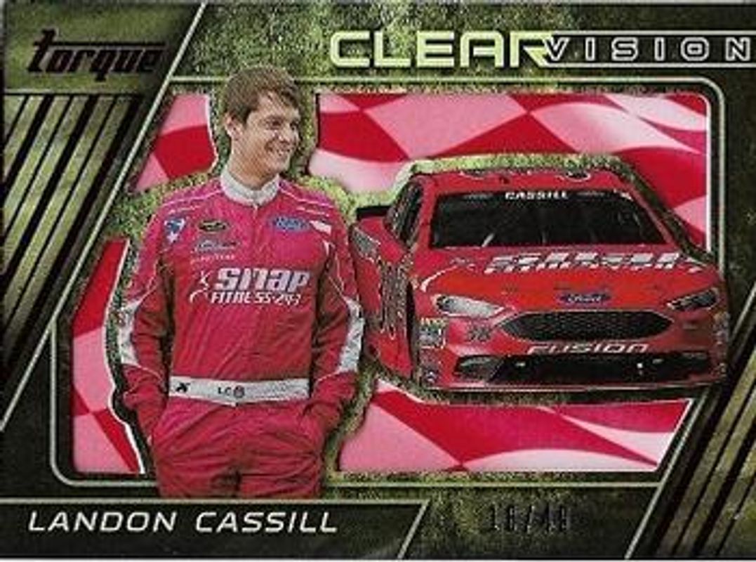 The Landon Cassill 2016 Torque NASCAR #23 Clear Vision Red /49 card is 1 of 38 Landon Cassill's card variations in the 2016 Torque NASCAR set being tracked by Sports Card Investor, including Base, Gold, Blue /125, Red /99, and Artist Proof /50.