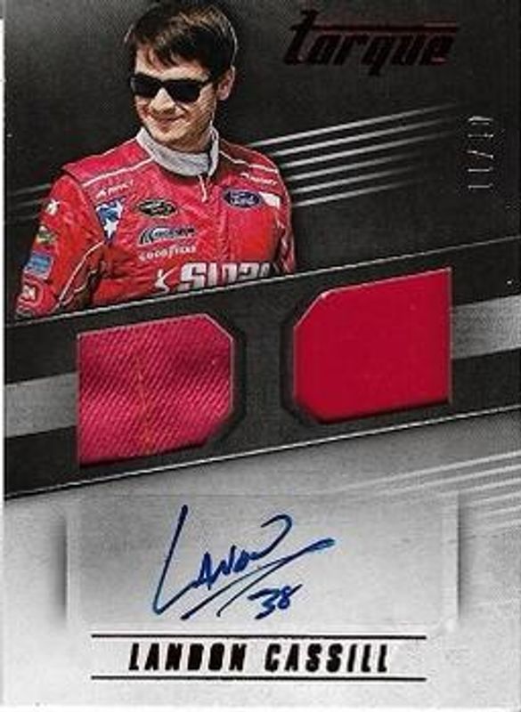 The Landon Cassill 2016 Torque NASCAR #CMS-LC Combo Materials Signatures Red /10 card is 1 of 38 Landon Cassill's card variations in the 2016 Torque NASCAR set being tracked by Sports Card Investor, including Base, Gold, Blue /125, Red /99, and Artist Proof /50.