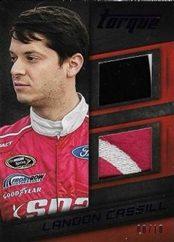 The Landon Cassill 2016 Torque NASCAR #DM-LC Dual Materials Purple /10 card is 1 of 38 Landon Cassill's card variations in the 2016 Torque NASCAR set being tracked by Sports Card Investor, including Base, Gold, Blue /125, Red /99, and Artist Proof /50.