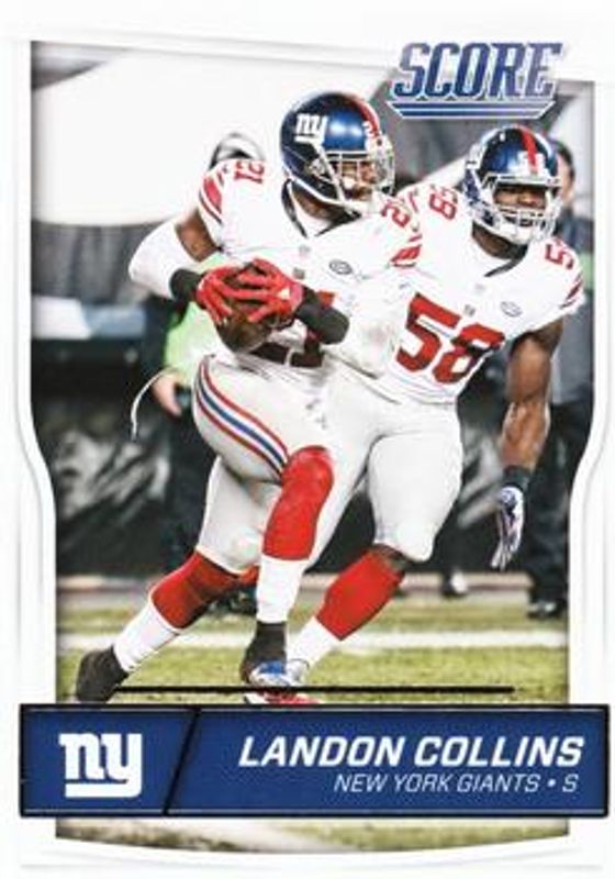The Landon Collins 2016 Score #218 Base card is 1 of 18 Landon Collins' card variations in the 2016 Score set being tracked by Sports Card Investor, including Scorecard, Jumbo Gold Zone /99, Showcase /99, Gold Zone /50, and Jumbo Artist's Proof /50.