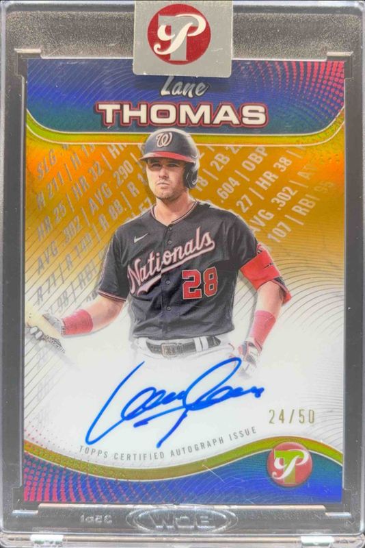 The Lane Thomas 2024 Topps Pristine #PPA-LT Pristine Production Autographs - Gold Refractor /50 card is 1 of 24 Lane Thomas' card variations in the 2024 Topps Pristine set being tracked by Sports Card Investor, including Base, Pristine Refractor, Refractor, Green Refractor /150, and Pristine Purple Refractor /99.