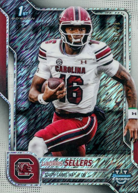 This card is 1 of 72 LaNorris Sellers' card variations in the 2025 Bowman Chrome University set being tracked by Sports Card Investor, including Base (1st), Pink Lava Refractor (1st), Refractor (1st), Shimmer Refractor (1st), and Stealth Refractor (1st).