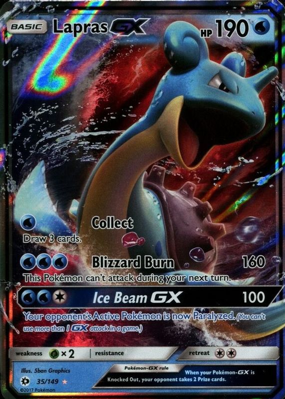 The Lapras GX 2017 Sun & Moon #035/149 Holo card in Raw TCG (Near Mint) condition has moved down -$3.37 (-63.3%) in the last 30 days and was last sold for $1.95 .