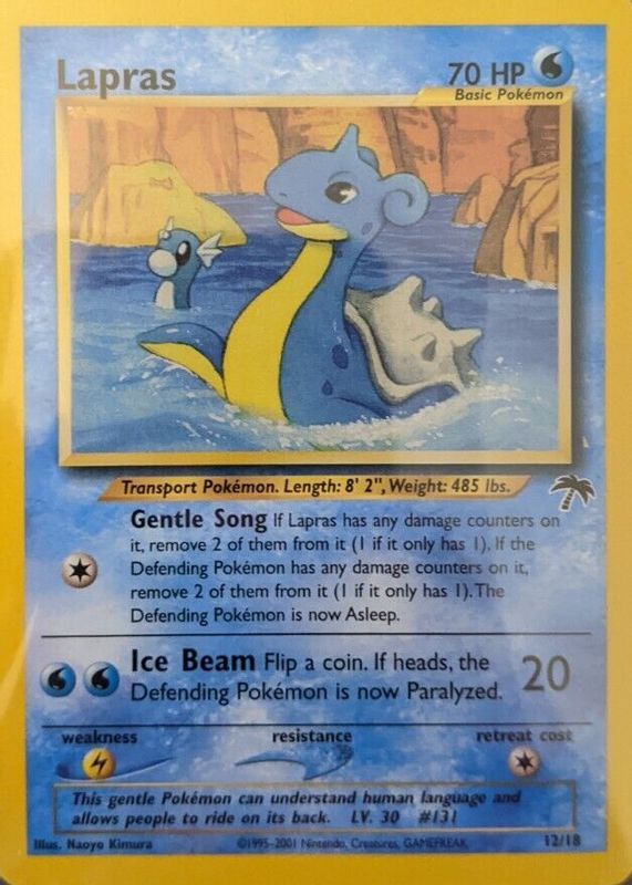 The Lapras 2001 Southern Islands #12/18 Base card in Raw TCG (Near Mint) condition has not changed in price in the last 30 days and was last sold for $27.99 .