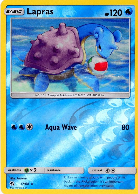 The Lapras 2019 Sun & Moon: Hidden Fates #17/68 Reverse Holo card in Raw TCG (Lightly Played) condition has moved down -$2.00 (-66.9%) in the last 30 days and was last sold for $0.99 .