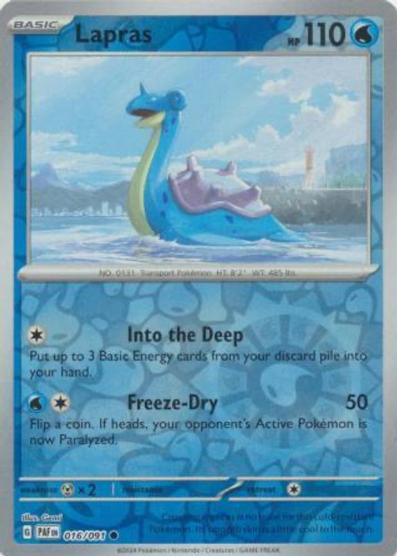 Lapras 2024 Scarlet & Violet: Paldean Fates #016/091 Reverse Holo RAW TCG (LIGHTLY PLAYED) Price Guide