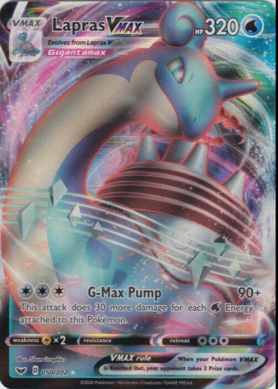 The Lapras VMAX 2020 Sword & Shield #050/202 Holo card in Raw TCG (Near Mint) condition has moved down -$3.00 (-52.2%) in the last 30 days and was last sold for $2.75 .
