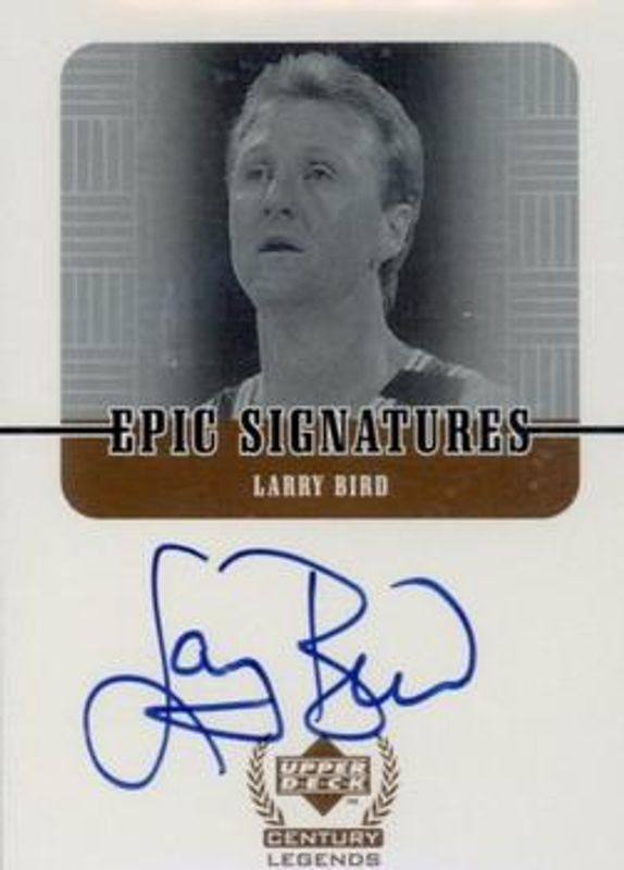 The Larry Bird 1998 Upper Deck Century Legends #LB Epic Signatures card is 1 of 6 Larry Bird's card variations in the 1998 Upper Deck Century Legends set being tracked by Sports Card Investor, including Base, Century Collection /100, All Century Team, Epic Signatures Century /100, and Jerseys of the Century /6.