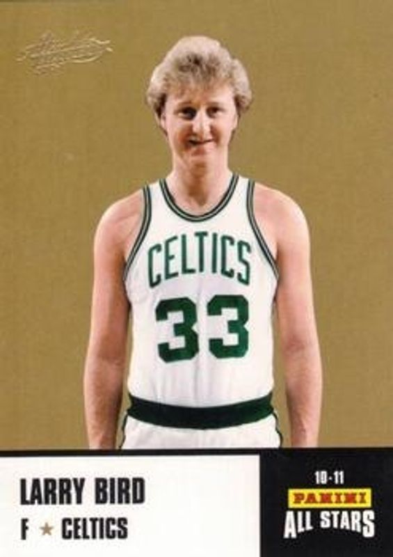 The Larry Bird 2010 Absolute Memorabilia #33 Panini All Stars Rack Pack card is 1 of 16 Larry Bird's card variations in the 2010 Absolute Memorabilia set being tracked by Sports Card Investor, including Absolute Heroes /399, NBA Icons /399, Absolute Heroes Spectrum /100, NBA Icons Spectrum /100, and NBA Icons - Materials /49.